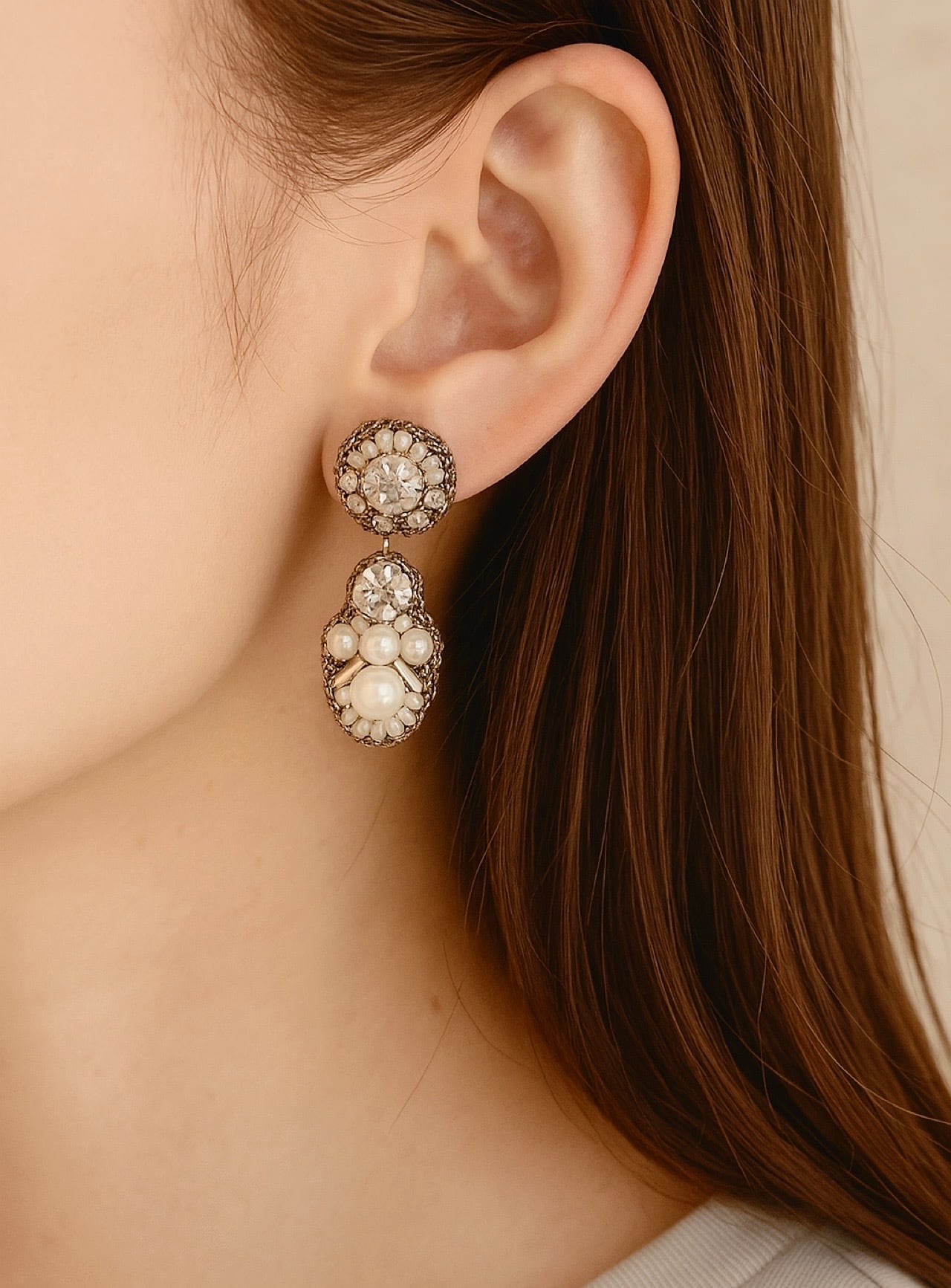手作業で丁寧に配置されたビジューとパールが光を受けて輝き、顔まわりを明るく華やかに演出。揺れるデザインが女性らしさを引き立てます。